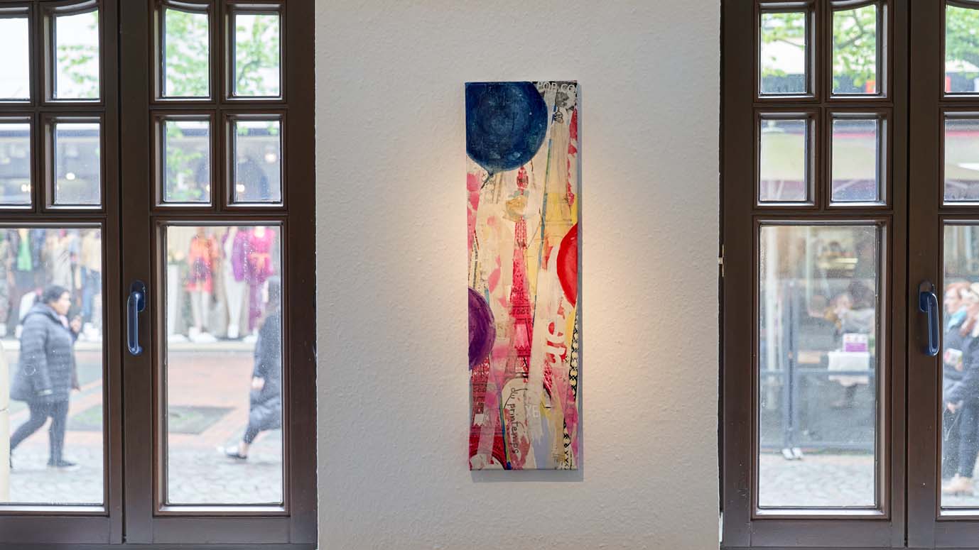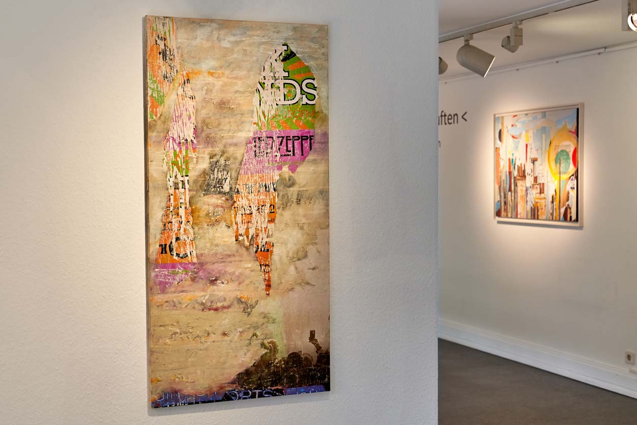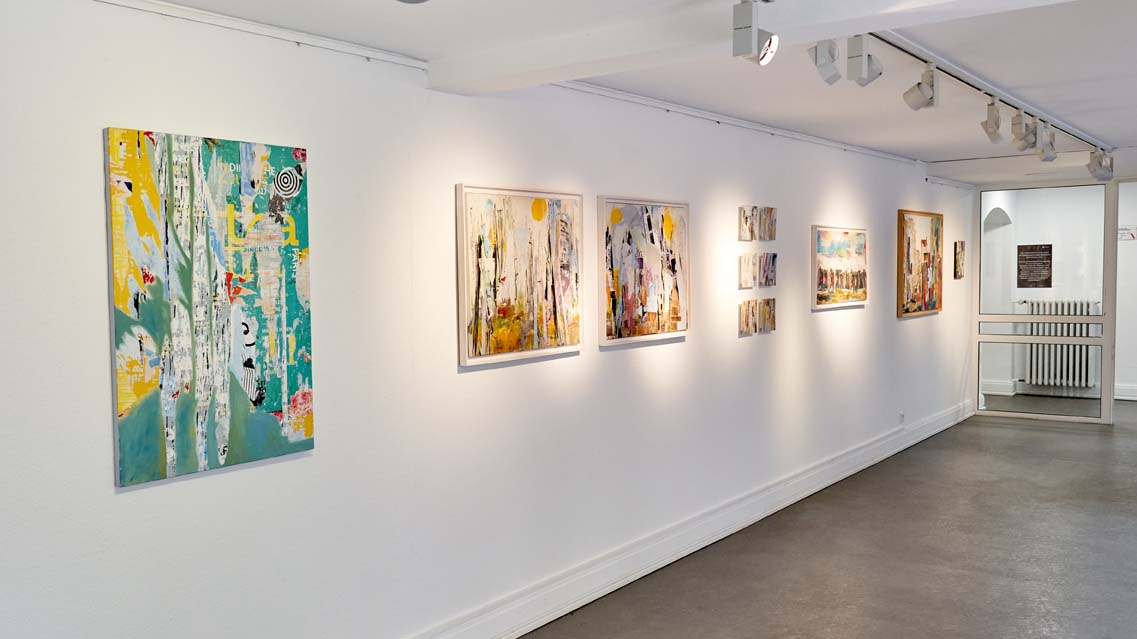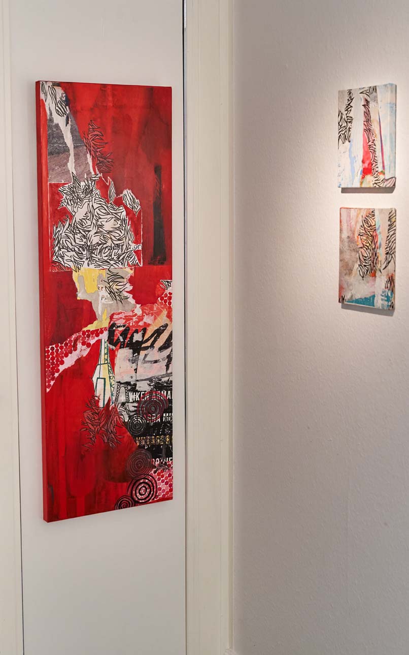 Das Übereinanderschichten dieser Papierfragmente auf der Leinwand lässt in einem spannenden Prozess das Bild entstehen: Malen, Zeichnen, Reissen, Kleben, Übermalen… viele der Werke entstehen Schicht um Schicht als Collagen.