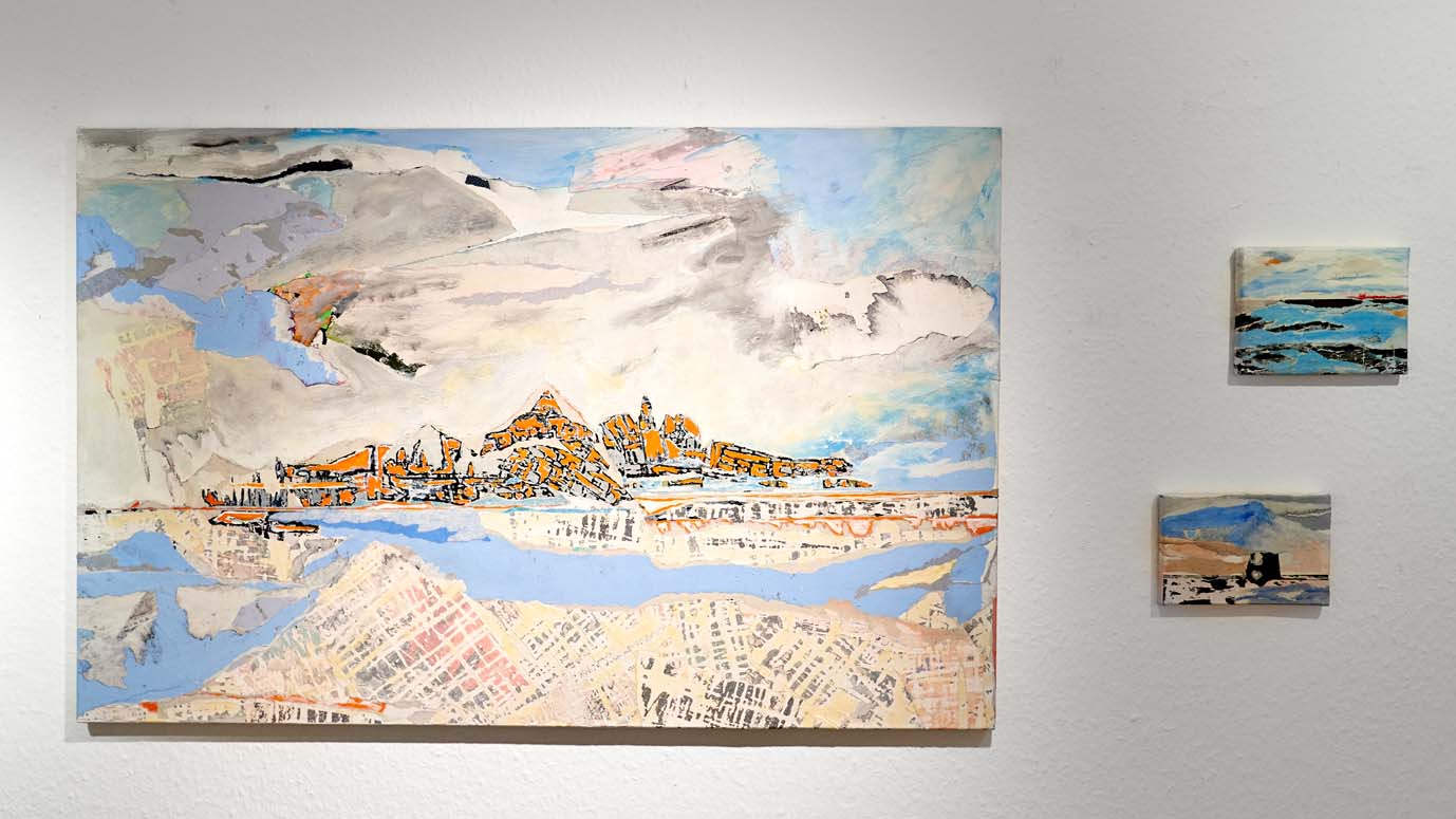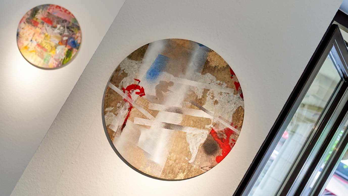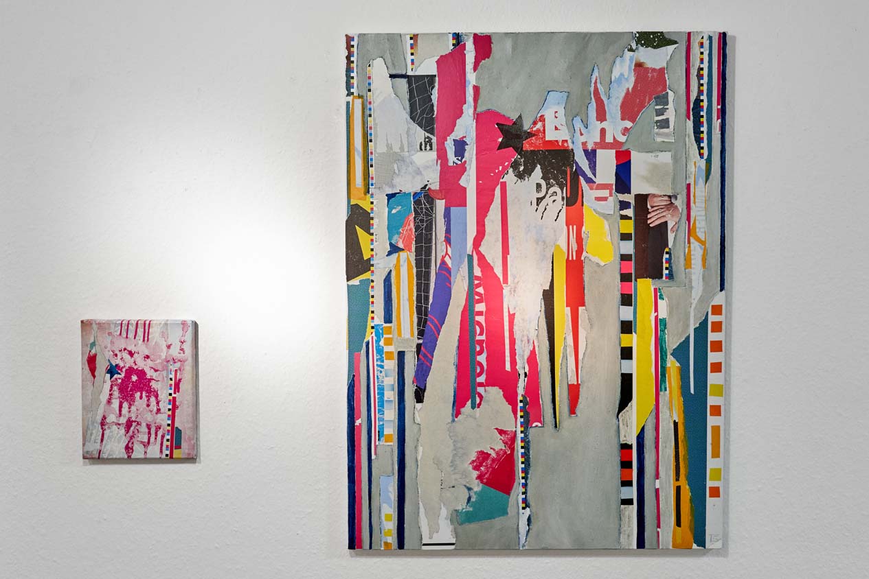Das Übereinanderschichten dieser Papierfragmente auf der Leinwand lässt in einem spannenden Prozess das Bild entstehen: Malen, Zeichnen, Reissen, Kleben, Übermalen… viele der Werke entstehen Schicht um Schicht als Collagen.